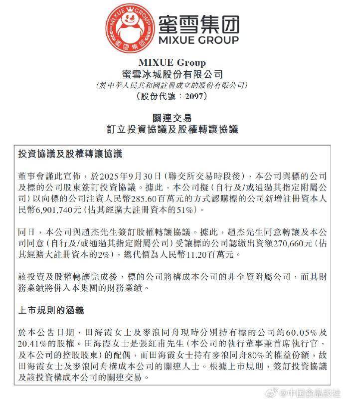 据中国食品报社消息:蜜雪冰城股份有限公司于10月1日发布公告称,其已在9月30日盘后与鲜啤福鹿家达成投资及股权转让协议——以约2.97亿元人民币的价格获得鲜啤福鹿家53%的股权。完成投资后,蜜雪集团的产品品类将从现制果饮、茶饮、冰淇淋和咖啡延伸至现打鲜啤,进一步满足消费者对高质平价产品的共同需求,践行“让全球每个人享受高质平价的美味”的使命。
